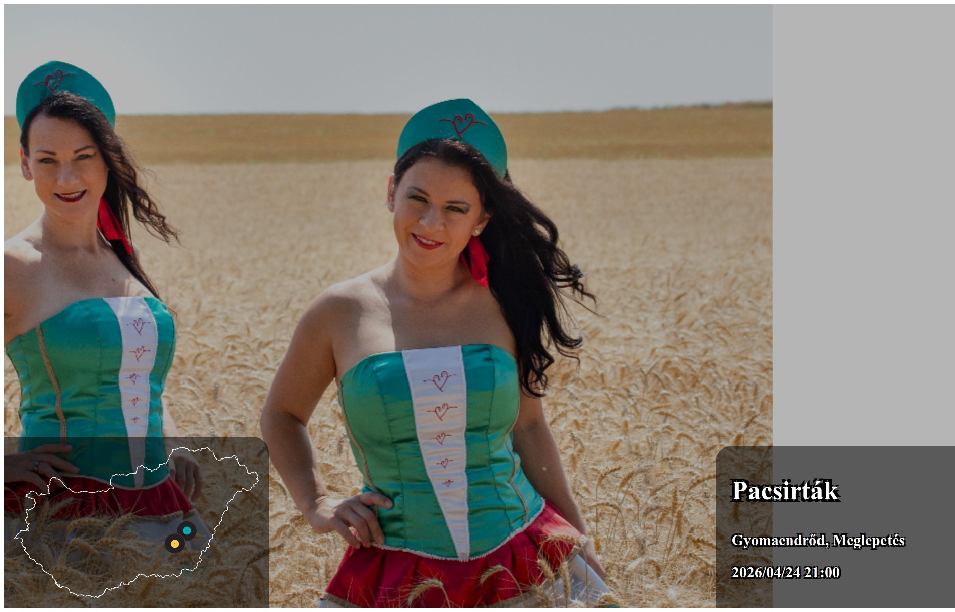 Az itt megjelenő eseményeket a produkció, vagy annak képviselője rögzítette. Az oldalon lévő információk valódiságáért a Koncertbooking.com ennek kapcsán felelősséget nem tud vállalni. Indulás előtt ellenőrizze az adott település vagy eseményhelyszín oldalán is a rendezvény paramétereit.